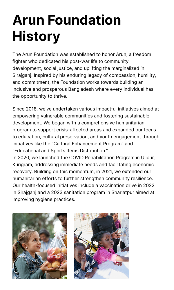 The Arun Foundation is a non-profit organization committed to the holistic development of children, adolescents, women, people with special needs, and marginalized communities across Bangladesh. Since its establishment in 2017, the Foundation has worked tirelessly to improve the quality of life for underprivileged populations through initiatives in education, health, nutrition, social development, and humanitarian support.